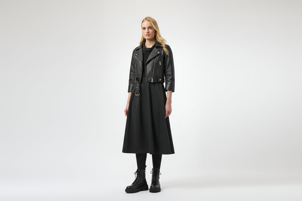 Elegante abito donna che unisce sofisticatezza e comfort. Il corpetto in jersey effetto seta offre una base raffinata, mentre il collo in tessuto memory si adatta perfettamente al vostro corpo, impreziosito da una broche che aggiunge un tocco di distinzione. La gonna arricciata, che scende dalla vita fino al polpaccio, crea una silhouette fluida e femminile. Le maniche 3/4 completano il design con eleganza senza tempo. Perfetto per occasioni speciali o per chi ricerca un capo versatile dal taglio impeccabile.