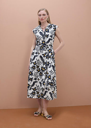 Abito in cotone puro con stampa fantasiosa che ritrae pappagalli e fiori su base sabbia, arricchito da dettagli grafici in nero e arancio. Caratterizzato da spalle ampie in stile kimono e apertura frontale che valorizza la silhouette. Completo di cintura coordinata e pratiche tasche laterali, rappresenta la scelta ideale per chi ricerca comfort senza compromessi stilistici. Un capo versatile che unisce eleganza naturale e funzionalità, perfetto per occasioni casual e semi-formali.