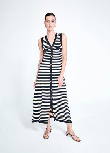 ABITO MAGLIA VISCOSA RIGATO CON BOTTONI Elegante abito in maglia di viscosa con righe sottili e bottoni oro che catturano la luce con raffinatezza. La spalla larga offre una silhouette moderna e confortevole, mentre la lunghezza alla caviglia garantisce un'allure sofisticata e versatile. La forma leggermente svasata segue le curve del corpo senza stringere, creando un effetto fluido e lusinghiero. Perfetto per occasioni formali o per elevare lo stile quotidiano con un tocco di classe. La viscosa assicura una caduta morbida e una sensazione piacevole sulla pelle, ideale per chi ricerca qualità e design consapevole.