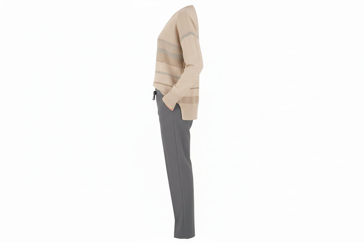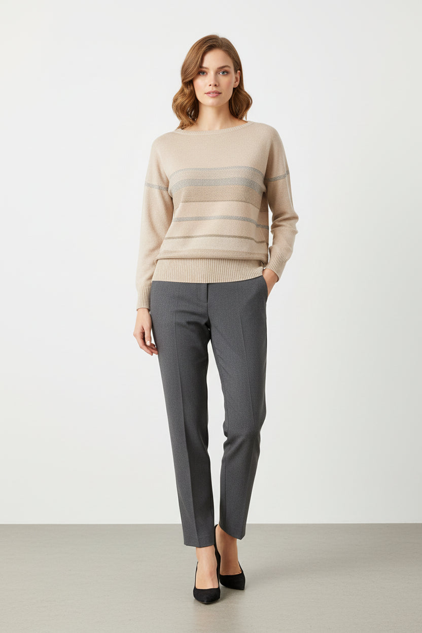 Questa elegante maglia con collo a barchetta in lana e cachemire è il capo perfetto per aggiungere un tocco di raffinatezza al vostro guardaroba. Realizzata con una pregiata miscela di lana e cachemire, offre una morbidezza eccezionale e un comfort superiore che vi accompagnerà durante tutta la giornata. Il design presenta delicati dettagli in lurex che catturano la luce, creando un effetto discreto ma luminoso che valorizza l'intero look. La finezza 16 garantisce una texture morbida e avvolgente, ideale per le stagioni più fresche. Il colore beige neutro rende questa maglia estremamente versatile, perfetta da abbinare con pantaloni eleganti per un outfit sofisticato o con jeans per un look più casual ma sempre curato. Il collo a barchetta dona un tocco femminile ed elegante, allungando visivamente il collo e le spalle. Questa maglia rappresenta l'equilibrio perfetto tra comfort quotidiano e stile ricercato, un must-have per chi apprezza i capi di qualità con dettagli preziosi.