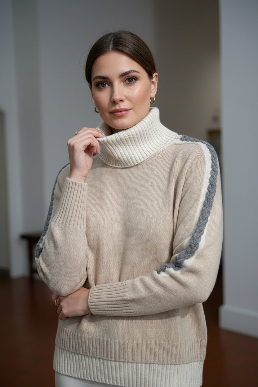 Capo sofisticato realizzato in filato Platinum, una miscela raffinata di lana, cashmere e seta che garantisce morbidezza e traspirabilità eccezionali. Caratterizzato da una treccia grigia in contrasto applicata sulla spalla, elemento che aggiunge profondità e interesse visivo al design. Il collo a ciambella con costine in bianco assicura una vestibilità ergonomica e un finish elegante. Facilmente lavabile, questo pezzo D-Exterior incarna l'eccellenza costruttiva e la versatilità stilistica, perfetto per chi apprezza dettagli curati e materiali di qualità superiore.