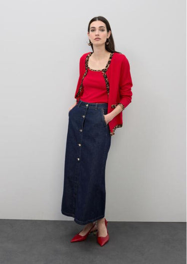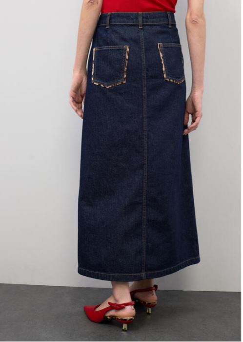 GONNA lunga in denim robusto con chiusura frontale a bottoni e tasche posteriori rifinite con piping maculato. Un capo versatile che combina funzionalità e stile, perfetto per chi ricerca dettagli curati e una silhouette moderna. La lavorazione del piping aggiunge carattere e movimento al design classico del denim.
