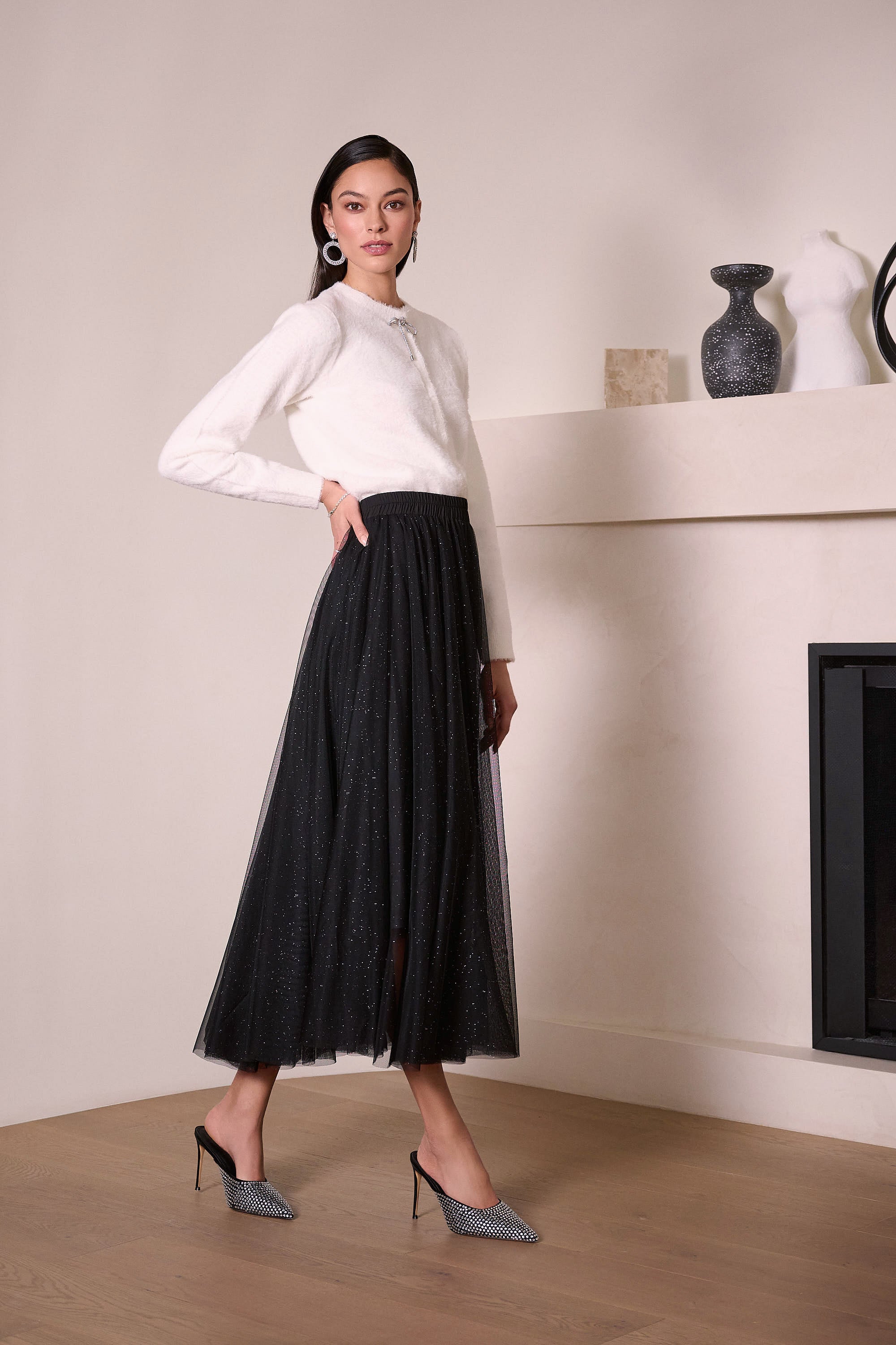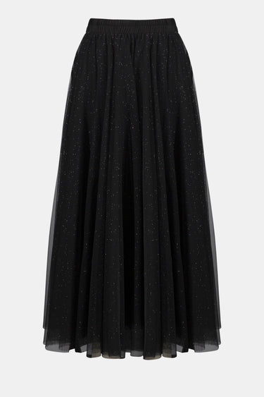 Gonna svasata in tulle a ruota intera con eleganti punti luce che catturano la luce naturale. Realizzata in doppio tulle arricciata in vita per una silhouette definita e confortevole, senza aperture laterali. Lunghezza alla caviglia per un effetto sofisticato e versatile. Un capo che combina movimento fluido e dettagli raffinati, ideale per occasioni speciali o per chi ricerca un'eleganza senza compromessi.