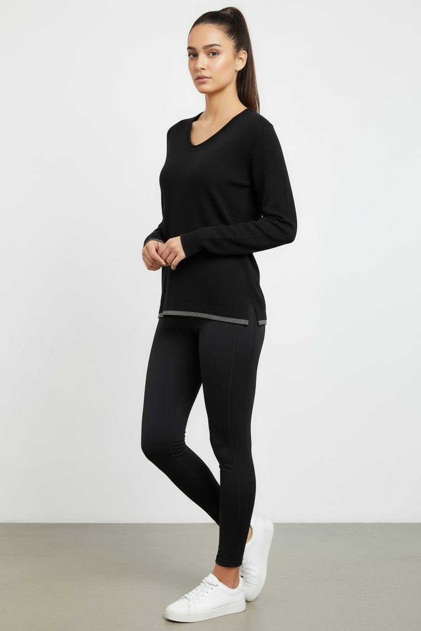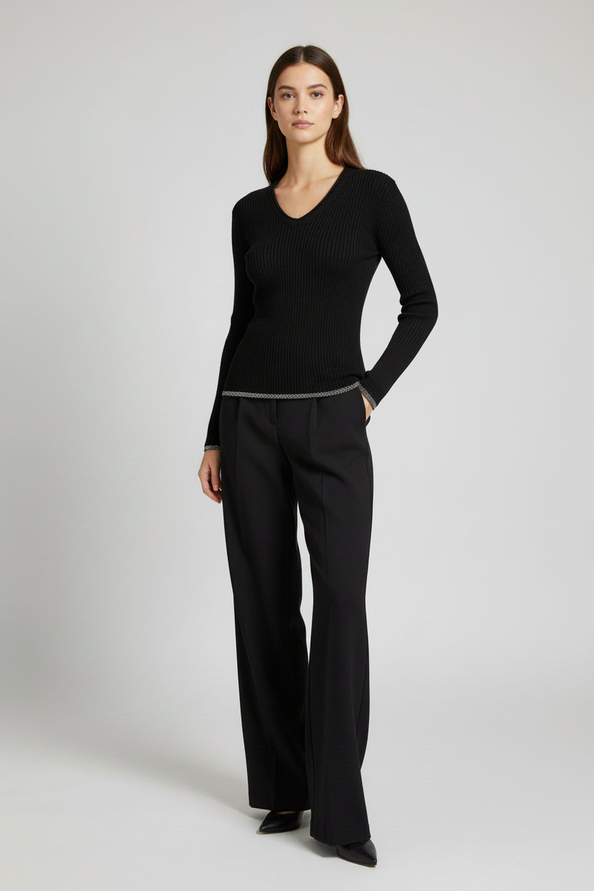 Elegante maglia donna in pregiato mix di lana, cashmere e seta firmata Fabiana Filippi. Lo scollo a V valorizza il décolleté con raffinata sobrietà, mentre la vestibilità sciancrata assicura una silhouette moderna e lusinghiera. Il dettaglio esclusivo del monile al fondo aggiunge un tocco di sofisticazione e movimento. Perfetta per occasioni speciali o per elevare il vostro guardaroba quotidiano con stile consapevole. Un'eleganza moderna e disinvolta prende forma in questa maglia scollo a V, creata con l'esclusivo filato Platinum di Fabiana Filippi, una combinazione di lana, cashmere e seta. Il brillante filo di diamante aggiunge un tocco prezioso a questo capo interamente Made in Italy, realizzato con attenzione alla sostenibilità.