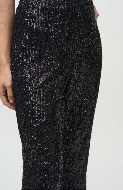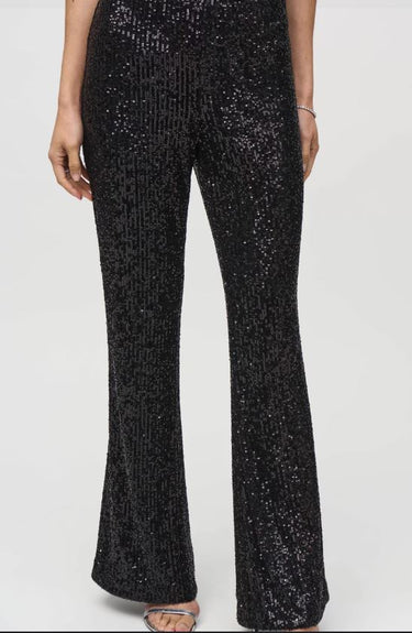 Pantaloni a vita alta Joseph Ribkoff che catturano l'attenzione con eleganza sofisticata. La silhouette a zampa lunga valorizza la figura, mentre la tinta unita garantisce versatilità negli abbinamenti. Le paillettes strategicamente posizionate aggiungono un tocco di luminosità senza compromettere la wearability quotidiana. Ideali per occasioni speciali, cene eleganti o serate in città, questi pantaloni incarnano lo stile contemporaneo con un'anima glamour. Un capo che eleva qualsiasi look con sicurezza e raffinatezza.