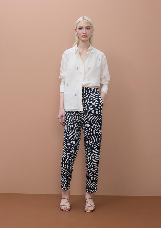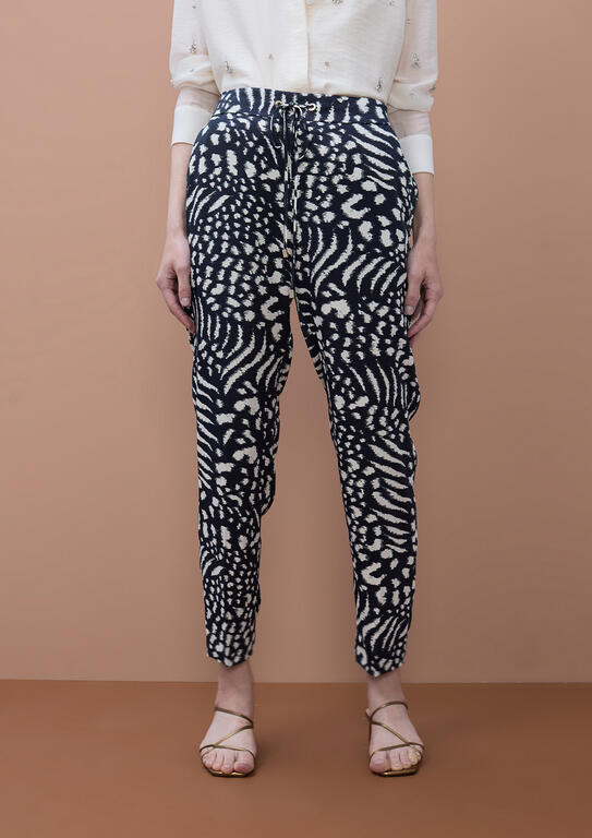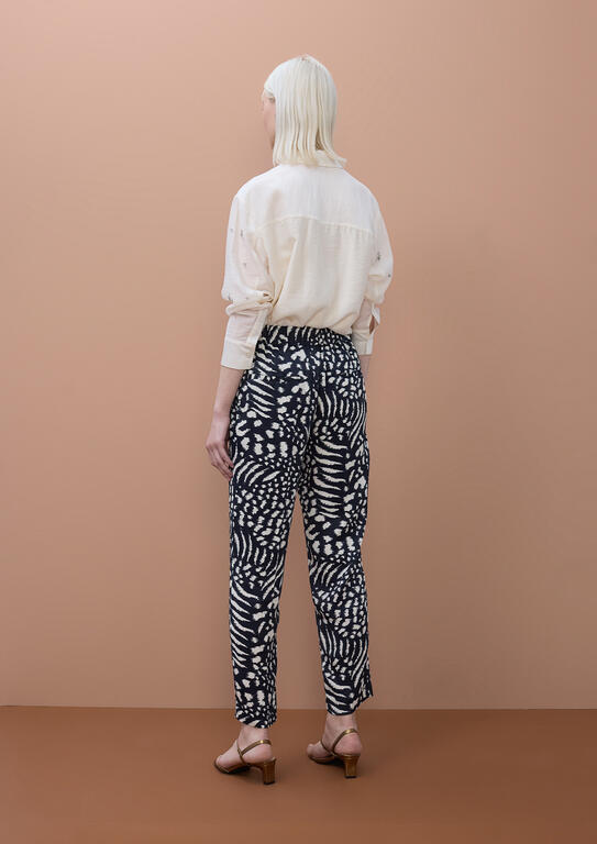 Pantalone jogger in viscosa ecologica con fantasia multicolore che combina blu, nero e beige. Caratterizzato da coulisse funzionali sia al retro che davanti per una vestibilità personalizzabile, dettagli a pendente per stringere e tasche laterali generose. Lo stile americano garantisce comfort e praticità, perfetto per chi ricerca un capo versatile che unisce estetica contemporanea e sostenibilità.