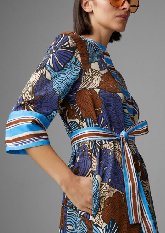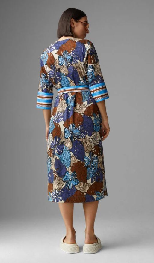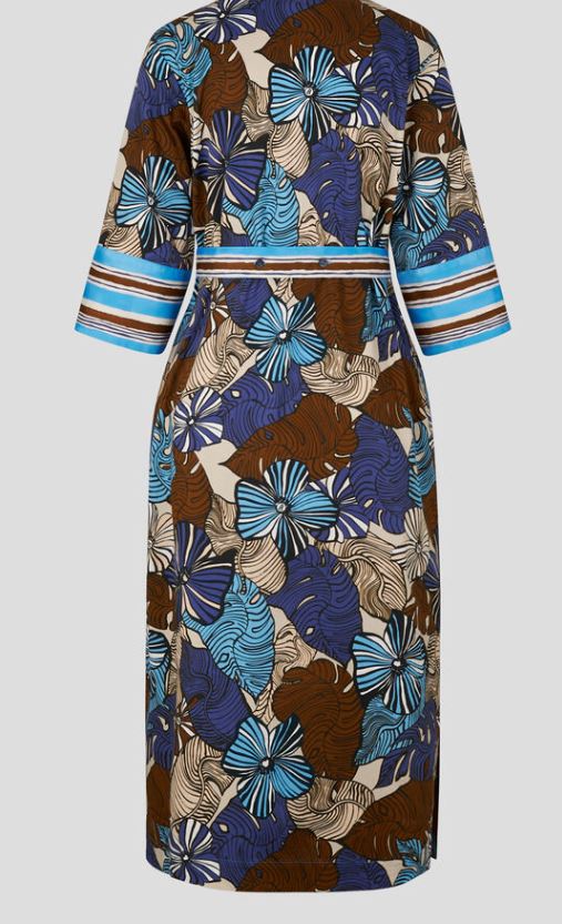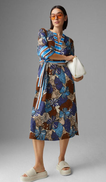 Abito Debbie in cotone elasticizzato con stampa floreale e dettagli a righe, perfetto per chi ricerca eleganza senza compromessi. Le maniche a tre quarti e gli spacchi laterali garantiscono libertà di movimento, mentre la cintura avvolgente in vita definisce la silhouette con precisione. Il tessuto in raso di cotone elasticizzato assicura comfort durante tutto il giorno, mantenendo una drappeggiatura raffinata. Un capo versatile che passa senza sforzo da occasioni formali a momenti più casual.